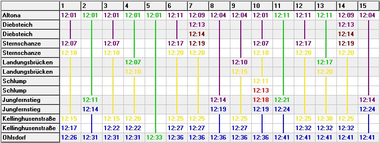 Im Beispiel oben ist in Spalte 8 die Ankunftszeit für die Station "Sternschanze" 12:19 Uhr. Die Abfahrtszeit für die Station Landungsbrücken in der gleichen Spalte ist 12:15 Uhr. Zwischen den beiden Zeiten befindet sich ein Lücke. Die nächste passende Abfahrtszeit für die Station "Sternschanze" ist 12:20 Uhr und befindet sich in Spalte 11. In diesem Beispiel werden statt zuvor 13 nur noch 12 Spalten benötigt.