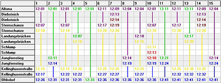 Im Beispiel oben ist in Spalte 9 die Ankunftszeit für die Station Sternschanze 12:19 Uhr. Die nächste Abfahrtszeit dazu ist 12:20 Uhr und steht in Spalte 12.